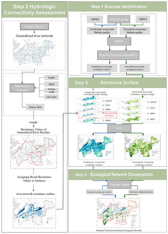This framework is particularly well-suited for regional ecological network planning in areas characterized by coexisting hydraulic infrastructure and landscape fragmentation. It offers actionable guidance for urban development regions with mixed freshwater–terrestrial landscapes. By facilitating the integrated implementation of ecosystem conservation and restoration strategies, the dual-network approach advances beyond traditional terrestrial ecological network methods, improving the identification of connectivity in human-modified watersheds and providing a more systematic and science-based foundation for functional landscape planning and national biodiversity conservation.