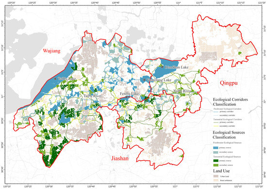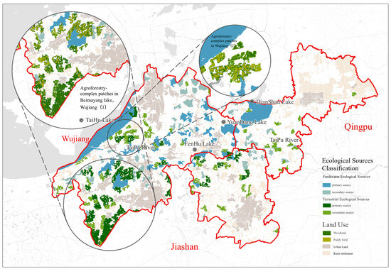 These connectivity patterns closely mirror ecological-source distributions (Figure 5): areas dominated by low-resistance channels—particularly in Wujiang and southwestern Qingpu—support extensive primary source patches, whereas high-resistance zones fragment sources into isolated “islands”. This fragmentation is most acute in the northeastern Jiaxing–Qingpu transition, which acts as a critical bottleneck, undermining network cohesion and limiting species dispersal between major habitat cores.