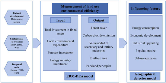 The research structure of the paper is illustrated in Figure 2, and the main innovations are reflected in (1) the inclusion of land elements in the indicator system of environmental efficiency to feedback the environmental effects of land urbanization process; (2) analyzing the influencing factors of LUEE in China from a macro perspective by taking the energy use perspective as an entry point; and (3) decoupling the analysis of LUEE in terms of energy use in order to propose differentiated land use and environmental protection strategies so as to enhance the resilience of the social–land–ecological system.