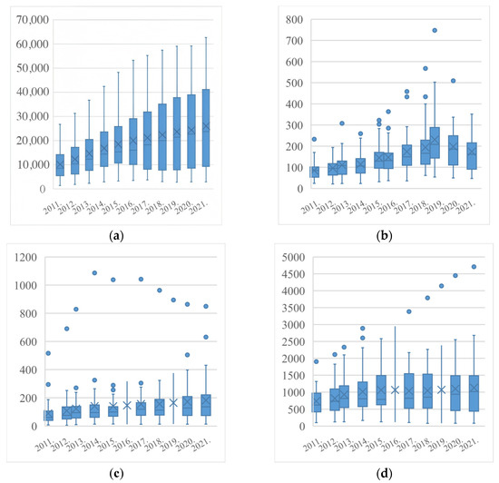 The amount of investment in fixed assets (Figure 3a) and the local environmental expenditure (Figure 3b) show the same trend of change, all of them increasing during the research period, illustrating that the environmental awareness of the government is gradually strengthening. The average value of forestry investment (Figure 3c) is also increasing in fluctuation, indicating that policymakers are focusing on enhancing the ability of forests to capture and store carbon by promoting the establishment and upkeep of forests. Moreover, the average trend of energy industry investment (Figure 3d) is relatively stable, but the difference between very large and very small values increases significantly after 2016, reflecting the differentiated characteristics of the development of the energy industry.
