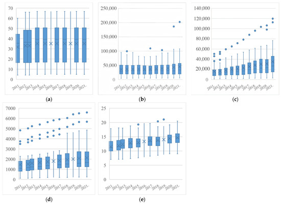 The fluctuations in forest cover (Figure 4a) are not significant, with little difference in values between years. However, as illustrated in (Figure 4b), the average value of CO2 emissions as a non-desired output changes relatively smoothly, but the great value in 2020–2021 shows a significant upward trend, which may be caused by the fluctuation of greenhouse gas emissions because of the adjustment of industries in certain regions. The added values of secondary and tertiary industries (Figure 4c), built-up area (Figure 4d), and green space per capita (Figure 4e) all show an increasing trend year by year, and the total value added of the secondary and tertiary industries sees a greater amount of growth.