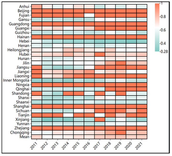 The spatial distribution characteristics of LUEE in China are shown in (Figure 6), which indicates that the eastern coastal municipalities have the highest total spatial efficiency rating, followed by the center area, while the western region has the lowest value. Specifically, the efficiency values of Liaoning, Shandong, Jiangsu and Zhejiang in the east are close to 1, which is due to the fact that the governments of economically prosperous areas prioritize the optimization of land use structure and the implementation of energy-saving and carbon reduction initiatives. To accomplish the environmental protection objectives outlined in the 13th Five-Year Plan, the government released the Regulations on the Implementation of the Action Plan for the Prevention and Control of Air Pollution in 2014. These regulations have significantly aided in decreasing emissions of carbon from industrial land use and enhancing the urban environment in these provinces. At the same time, China issued the United States–China Joint Statement on Climate Change, which sets out China’s milestones for green and sustainable development, and the government has since made “greening” a key national strategy.