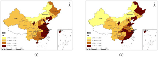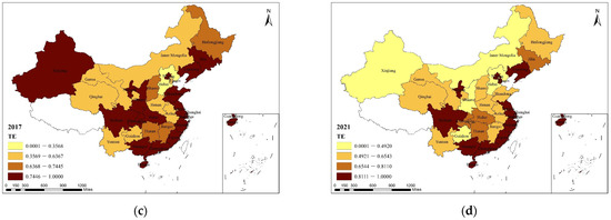 Geographical distribution of land use environmental efficiency in China: (a) distribution of spatial features of total efficiency in 2011; (b) spatial distribution features of total efficiency in 2014; (c) geographical distribution of total efficiency in 2017; (d) spatial distribution characteristics of total efficiency in 2021.