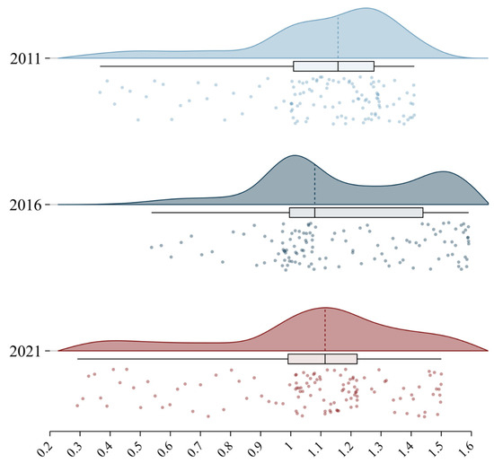 As can be seen from Figure 7, the kernel density curves at the national level are distributed differently in different years. And the center moved to the left in 2016 and to the right in 2021. This indicates that land use environmental efficiency is fluctuating but improving overall. The kernel density curve shows a trend of decreasing the height of the main peak and widening the width of the peak, indicating that the absolute difference in LUEE in different regions increased during the observation period. From the perspective of ductility, the right tailing of the land use environmental efficiency kernel density curve in 2011 and 2021 was gradually obvious, indicating that the land use environmental efficiency of some regions is significantly higher than that in other regions.