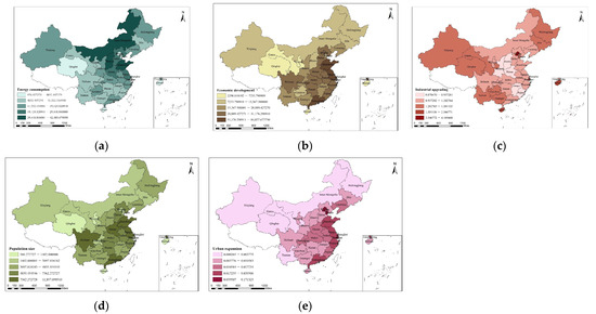 The Risk Detector revealed differences between the gradations within each driving factor. This study selected five factors, energy consumption (EC), economic development (ED), industrial upgrading (IU), population size (PS), and urban expansion (UE), whose spatial distributions are shown in Figure 8. EC is measured by the total local energy consumption, ED is measured by the total local GDP, IU is measured by the ratio of the added value of the local secondary and tertiary industries to GDP, PS is measured by the local resident population, and UE is measured by the ratio of the urban area to the total local land area. However, it must be pointed out that the urban area is not equal to the built-up area, and urban areas generally include undeveloped areas.