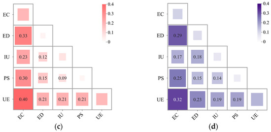 From an input cost perspective, China’s economy is currently in the process of transforming from industry to business services, with local governments being politically incentivized to provide land for construction. The slowdown in industrial development after 2015 means that the advancement of energy-consuming traditional industries and manufacturing has slowed down [35], which in turn reduces the environmental pressure on industrial land. In addition, due to the continued rise in land rental and labor costs, industrial land rental rates declined after 2016 and technological innovations promoted cleaner production by firms, thus reducing energy consumption by industrial firms and increasing LUEE [36].