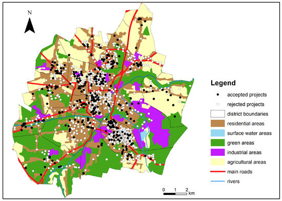 The highly generalized characteristics of land use in Częstochowa (based on municipal data from 2019) and location of analyzed projects (2015–2019). Rejected projects—projects that were not selected for implementation; accepted projects—projects that were selected for implementation. Source: prepared by K. Groszek.