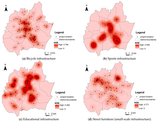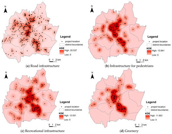 The highest number of projects proposed was in the category of road infrastructure. The maximum density index for this category was KDEmax = 20.54. Road infrastructure projects were proposed in all districts of the city, especially in central districts of dense construction (Figure 3a). However, this type of project was less frequent in areas with a high share of “other roads and associated land” (rs = −0.49; p = 0.028), i.e., in areas where road density was already high.
