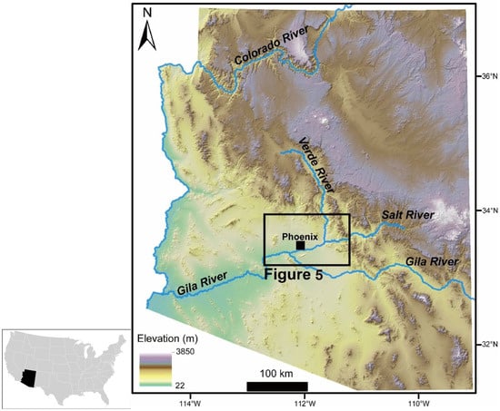 - Jeong, A.; Cheung, S.Y.; Walker, I.J.; Dorn, R.I. Urban Geomorphology of an Arid City: Case Study of Phoenix, Arizona. In Urban Geomorphology Landforms and Processes in Cities; Thornbush, M.J., Allen, C.D., Eds.; Elsevier: Amsterdam, The Netherlands, 2018; pp. 177–204. [Google Scholar] [CrossRef]