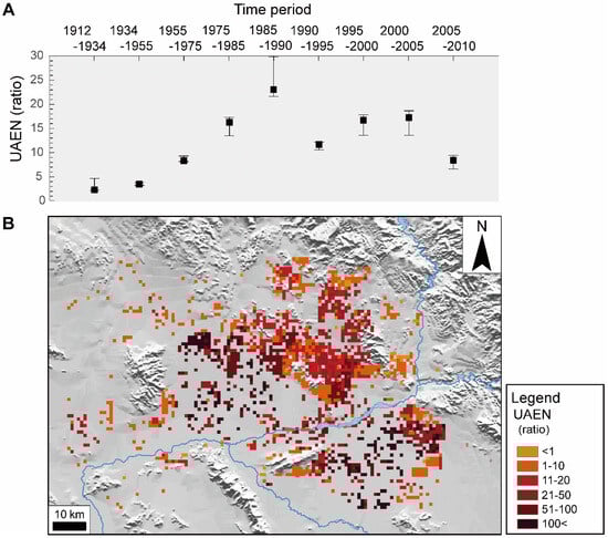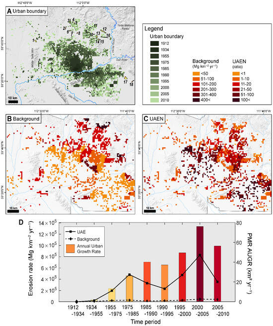 | Time Period | LT 1 (yr) | ABG 2 (km2) | AUGR 3 (km2 yr−1) | Background ± 1σ (Mg) | UAE ± 1σ (Mg) | Background ± 1σ (Mg km−2 yr−1) | UAE ± 1σ (Mg km−2 yr−1) | UAEN 4 Mean | (−1σ) | (+1σ) |