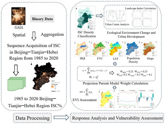 This study aims to construct a long-term ISC dataset for the Beijing–Tianjin–Hebei region through spatial aggregation methods and by analyzing urban expansion processes and ecological vulnerability patterns, as well as establishing quantitative relationships between urbanization intensity and ecosystem responses to provide scientific support for sustainable regional development strategies. The technical path and analytical framework proposed in this study have multi-dimensional scientific support value for urban ecological security monitoring and spatial regulation in the Beijing–Tianjin–Hebei region. For the ecological vulnerability early warning of high-density urban agglomerations, its core lies in establishing an associated analysis paradigm of “impervious surface dynamics—multi-factor ecological response”: first, converting 30 m resolution impervious surface binary data into 1 km resolution Impervious Surface Coverage (ISC) data through spatial aggregation methods, which solves the scale matching problem between micro data and macro analysis; second, introducing the projection pursuit model to calculate the weights of ecological sensitive factors, avoiding the deviation caused by subjective weighting and improving the objectivity of evaluation results; finally, based on the coupling characteristic analysis of key time nodes, it can capture the evolution law of ecological vulnerability in different development stages. This complete process can be directly transferred to other high-density urban agglomerations such as the Yangtze River Delta and the Pearl River Delta, providing standardized tools for analyzing the urbanization ecological effects in similar regions and establishing a normalized ecological vulnerability early warning mechanism.