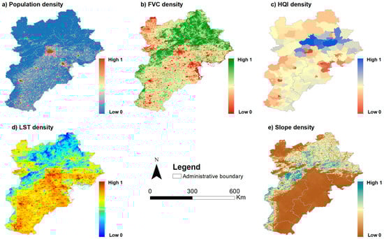 To construct an Impervious Surface Coverage (ISC) dataset with temporal continuity and sub-pixel expression capability, this study selected the 30 m resolution annual binary impervious surface products (1985–2020) provided by GAIA (Global Artificial Impervious Area), where pixel values of 1 represent impervious surfaces and 0 represents non-impervious surfaces. The GAIA dataset demonstrates high accuracy with overall accuracies ranging from 89% to 97% across validation years, with a mean overall accuracy higher than 90% globally and 89% specifically in arid regions using improved algorithms []. Considering the low-density development characteristics in urban expansion processes and macro-scale analysis requirements, spatial aggregation methods were employed to convert these into 1 km resolution proportional impervious data. The 1 km resolution was specifically chosen to maintain spatial consistency with other variables in our EVI assessment framework (MODIS-derived FVC and LST data, population density data), while providing an optimal balance between capturing regional urbanization patterns and computational efficiency for the 35-year time series analysis across the 216,000 km2 study area. Using 33 × 33 pixels (corresponding to approximately 1 km × 1 km) as aggregation units, the number of impervious pixels with values of 1 within each unit was counted and divided by the total number of pixels to calculate the impervious surface proportion within that 1 km pixel. While this aggregation process inevitably smooths fine-scale heterogeneity and may underestimate urban fragmentation in areas with highly dispersed settlement patterns, it preserves the essential spatial gradients needed for regional-scale urbanization analysis and policy-relevant applications. The high accuracy of the source GAIA data (>90% mean overall accuracy) ensures the reliability of our spatially aggregated ISC dataset. All annual data were processed in the same manner, ultimately generating continuous ISC proportion data sequences from 1985 to 2020. This ISC dataset provides high-resolution, long-term temporal spatial support for subsequent urbanization intensity identification, spatial pattern evolution analysis, and ecological vulnerability assessment, with good regional applicability and explanatory power.