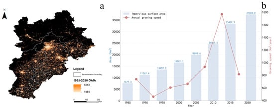 Impervious surface change in the Beijing–Tianjin–Hebei (BTH) region. (a) Land cover change mapping using GAIA data from 1985 to 2020. (b) Expansion area and changing rate of GAIA from 1985 to 2020.