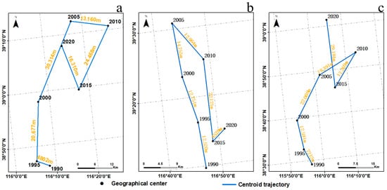 Figure 6a shows that the centroid of the Beijing–Tianjin–Hebei region exhibited a northward-then-southward transfer trend from 1990 to 2015. During 1990–2000, influenced by the early urbanization of Beijing and Tianjin, the centroid moved closer to the Beijing–Tianjin corridor. During 2005–2015, the urban centroid moved toward the southeast, reflecting the enhanced economic growth and population agglomeration effects in southeastern Hebei. The relatively short centroid movement distance indicates that regional overall development is relatively balanced, but there exists slight spatial imbalance.