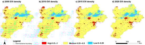 Four periods of data from the years 2005, 2010, 2015, and 2020 were selected, and according to the regional divisions classified by ISC density levels, different weights were assigned to different indicators, ultimately calculating the EVI results for different ISC density regions as shown in Figure 7. Overall, the ecological vulnerability in the Beijing–Tianjin–Hebei region exhibits obvious geographical spatial variability, with EVI levels divided into three categories: low (0–0.25), medium (0.25–0.5), and high (0.5–1). The ecological vulnerability index is higher in urban centers, while it is lower in the mountainous areas of northern Beijing and eastern Hebei, which mainly reflects that the abundant forest resources in the northeastern part of the Beijing–Tianjin–Hebei region can protect their ecological environment at any time. The main changes occur in high-value areas of ecological vulnerability, which are also the most noteworthy regions. The high-value areas of ecological vulnerability in Beijing’s urban center show no obvious changes, while in Tianjin and Tangshan, the high-value areas of ecological vulnerability show obvious expansion trends. The high-value areas of ecological vulnerability in the northwestern Beijing–Tianjin–Hebei region show a reduction trend. The low-value areas of ecological vulnerability gradually decreased from 2005 to 2015, then recovered in 2020.