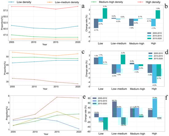 In the trend of low EVI value changes in different ISC density areas, high ISC density areas have the highest low EVI values, fluctuating between 58 and 59%, with a slight decline in 2015 but recovering to 59.12% by 2020. Low ISC density areas rank second, fluctuating between 49.91 and 51.35%. Medium-high and medium-low ISC density areas have the lowest EVI values, ranging between 46–47.5% and 45.7–45.8%, respectively (Figure 8a). Notably, both low and high ISC density areas showed positive growth during 2015–2020, at 2.3% and 1.9%, respectively, while they mostly showed negative growth during 2005–2010 and 2010–2015 periods (Figure 8b).