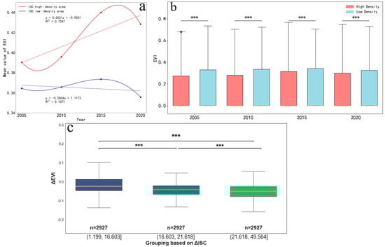 Temporal coupling relationship between urbanization process and ecological vulnerability. (a) Trends of EVI changes in different density zones. (b) Statistical comparison of EVI between high- and low-density ISC areas. (c) Boxplot of EVI changes under ISC variation zones. (p < 0.001, indicated by ***).