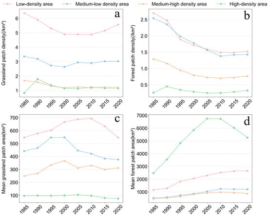 Trends of landscape index changes from 1985 to 2020. (a) Grassland patch density. (b) Forest patch density. (c) Mean grassland patch area. (d) Mean forest patch area.