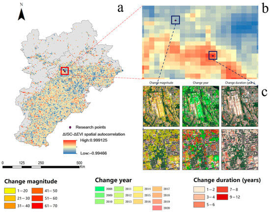 Spatial coupling relationship between urbanization process and ecological vulnerability. (a) Pearson correlation coefficient between ISC and EVI change values during 2005–2020. (b) Representative study areas. (c) The magnitude, timing, and duration of impervious surface increase around Beijing Capital International Airport and Temple of Heaven Park.