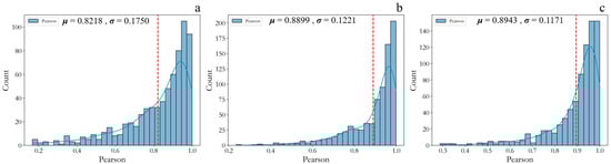 Pearson correlation coefficient distributions between ISC and GHSL data across three major urban agglomerations. (a) Beijing–Tianjin–Hebei. (b) Yangtze River Delta. (c) Pearl River Delta.