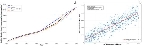 Comparison of ISC with other global urban products over the past years. (a) Time series comparison of annual impervious surface area trends []. (b) Correlation analysis of ISC with GISA from 700 random sampling points (1985–2019).