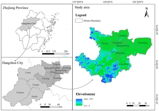 The central urban area of Hangzhou (119°43′ E–120°38′ E, 29°57′ N–30°36′ N) is located in the north-central part of Zhejiang Province, China, and it is regarded as a key component of the Yangtze River Delta urban agglomeration (see Figure 1). It mainly consists of Shangcheng District, Gongshu District, Xihu District, Binjiang District, Qiantang District, Xiaoshan District, Fuyang District, Yuhang District, and Linping District, covering a total area of approximately 4857 square kilometers. This region is characterized by a typical subtropical monsoon climate, with an average annual temperature of 17.2 ± 0.5 °C and annual precipitation of 1500 ± 218 mm, exhibiting a clear pattern of synchronized heat and rainfall. The terrain is primarily composed of plains, hills, and low mountains. The Qiantang River winds through the entire area from southwest to northeast and eventually flows into Hangzhou Bay. Significant ecological areas, such as West Lake and Xixi Wetland, endow Hangzhou with a unique natural landscape.