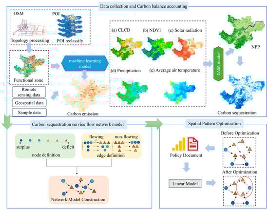 The research framework of this paper consists of three main parts, and the “source-sink-flow” analysis logic is the main line throughout the entire research process. First, based on previous research data and the CASA model, this study evaluated surface carbon fixation and identified the carbon balance at the scale of urban functional zones, thereby clarifying the spatial patterns of “source” and “sink” areas. Second, using a “source–sink–flow” network model, the flow paths of carbon sequestration ecosystem services were quantitatively traced, and key connections and disruptions within the carbon emission process were identified. Finally, a low-carbon land-use structure optimization model was employed to simulate interventions targeting typical deficit nodes, and spatial layout optimization strategies were proposed to support the reconstruction of carbon flow and the balanced regulation of ecosystem service provision across urban functional zones. The specific flow is shown in Figure 2.