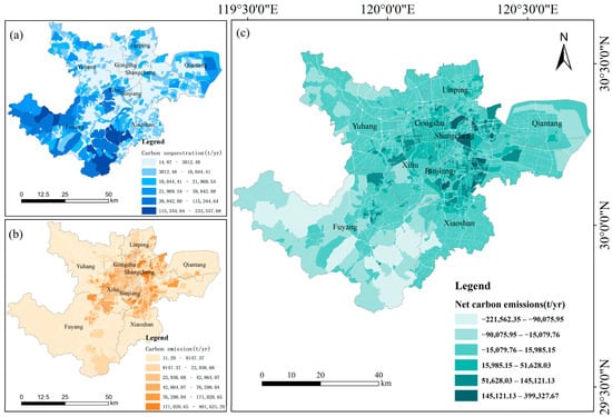 (1) The carbon balance in Hangzhou exhibits significant spatial variation, characterized by a pattern of “carbon deficit in the center and carbon surplus in the periphery.” The residential–commercial and commercial–public functional zones in the main urban area show high carbon emission intensity and low carbon sequestration capacity, forming evident carbon-deficit areas. In contrast, green space–agricultural functional zones, such as those in Fuyang and southern Xiaoshan, demonstrate strong carbon sequestration capacity and constitute the main carbon sink regions.