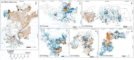Based on node information, the carbon sequestration service was visualized as a service flow network using ArcGIS, as shown in Figure 5. A total of 3861 nodes were identified in the study area, each representing either a carbon surplus or carbon deficit status, while 3602 edges indicated the connections and transmission directions of carbon sequestration service flows. The main urban area (Figure 5a) was identified as a region with a severe shortage of carbon sequestration services, where carbon deficit nodes accounted for 90.3% of the total nodes, and numerous interrupted edges were observed in the carbon flow network. Carbon flow transfer paths are relatively limited; carbon sequestration services primarily flow from residential–green space and green space plaza functional zones to residential and commercial functional zones. The flow directions are relatively concentrated, and the intensity is weak. In the western part of Qiantang District (Figure 5c), Linping District (Figure 5e), and the northern part of Xiaoshan District (Figure 5f), a large number of carbon surplus nodes were identified, accounting for 47.4%, 29.9%, and 42.3% of the total number of nodes in each respective district. Among them, the carbon flow transmission intensity from green space plazas and comprehensive functional zones to commercial and industrial functional zones was the highest. Notably, some non-ecological functional zones also exhibited carbon surplus status. However, due to insufficient excess carbon sequestration capacity, the overall carbon flow supply remained inadequate, making it difficult to effectively meet the carbon fixation demand in central urban functional zones. Although 28.8% and 34.2% of nodes in Fuyang District and Yuhang District (Figure 5b,d), respectively, showed carbon deficits, the interregional transmission driven by atmospheric circulation helped maintain carbon flow paths to some extent, preserving the basic connectivity of the carbon sequestration service flow network.