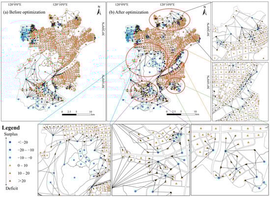 Spatial pattern optimization under the low-carbon development goal resulted in a significant overall improvement in the carbon surplus levels of functional zones across Hangzhou, with the most notable enhancement observed in the main urban area. As shown in Figure 6, the proportion of carbon surplus nodes in composite functional zones, such as residential–green space, commercial–green space, and industrial–green space, increased from 9.7% before optimization to 13.4% after optimization, representing approximately a 1.38-fold growth. In the green space plaza functional zones, some areas that were previously in a carbon deficit state achieved a positive carbon balance, with significantly enhanced carbon sequestration capacity. Meanwhile, the structural connectivity of the carbon flow network was also improved, with 369 peripheral carbon flow links restored, indicating a notable enhancement in transmission performance. However, due to the high intensity of land development in the main urban area and the limited availability of ecological space for carbon sequestration, the overall carbon surplus remains insufficient to fully offset the high level of emission demand, despite some enhancement in carbon sink capacity. Based on the findings above, it is suggested that in areas with a high concentration of carbon-deficit nodes, surplus-node demonstration zones should be established. Functional types with carbon sink potential should be prioritized in the core areas of these deficit clusters, allowing them to develop into carbon-surplus zones capable of providing carbon sequestration services to surrounding areas, thereby alleviating local imbalances.