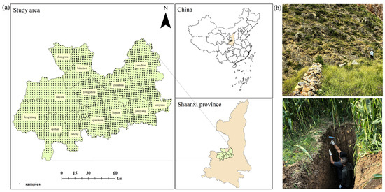 Study area and fieldwork scenes. (a) Geographical location of the study region, including its position in China, Shaanxi province, and a detailed map with sampling points; (b) Photographs of field-investigation activities.