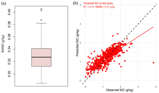 Model accuracy evaluation results. (a) Distribution of RMSE from 100-repeated five-fold cross-validation; (b) Scatter plot of predicted SIC values vs. independent validation observations.