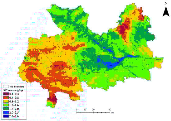SIC content also showed substantial variation across administrative units (Table 4). The overall range at the county level spanned from 0.10 g/kg (Qishan) to 3.56 g/kg (Liquan), with an average value of approximately 1.20 g/kg. The greatest intra-county range was observed in Fengxiang (2.64 g/kg), while Changwu exhibited the narrowest range (0.95 g/kg). Mean SIC content varied notably among counties, with the lowest average found in Qishan (0.71 g/kg) and the highest in Liquan (1.58 g/kg). Standard deviation (Std) values indicated differences in intra-county variability, ranging from 0.17 g/kg in Changwu to 0.46 g/kg in Yaozhou, reflecting relatively homogeneous and heterogeneous distributions, respectively, within these locations.
