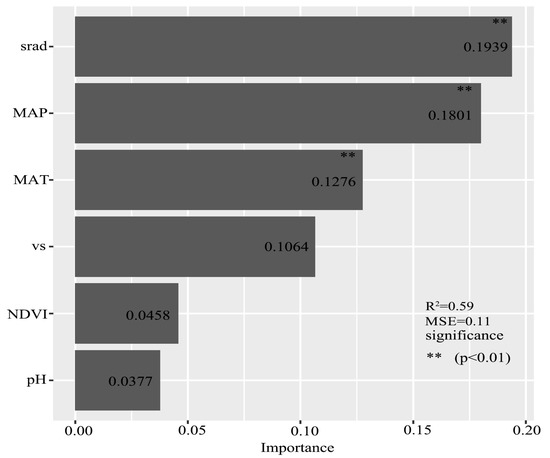 The spatial differentiation of SIC in arid–semi-arid landscapes arises from a complex interplay of environmental factors [41]. Through RF modeling and optimal-parameter Geodetector analysis, this study identified srad, MAP, MAT, and vs as the principal drivers of SIC variation in the Weibei Loess region.