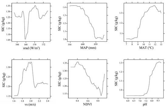 SIC content exhibited a complex, non-monotonic response to variations in srad. When srad was below approximately 167 W/m2, SIC content showed a general declining trend, with a steeper decrease at lower radiation levels. Between 167 and 167.5 W/m2, SIC values rose slightly, followed by a sharp decline from 167.5 to 168 W/m2, where the lowest SIC values were observed. From 168 to 170 W/m2, SIC content increased rapidly, reaching its overall peak. A subsequent sharp decline occurred between 170 and 171 W/m2, followed by a moderate increase up to around 173 W/m2. Apart from the sharp fluctuation near 168 W/m2, SIC values at other srad levels were predominantly above 1.23 g/kg; SIC content exhibited a consistent negative trend within the 550–650 mm range of MAP. Beyond 650 mm, the decline in SIC values plateaued, indicating no further reduction with increased precipitation; SIC content remained consistently low at MAT < 9 °C. A sharp increase was observed between 9 °C and 11.5 °C, after which SIC content began to decrease again. The curve exhibited a unimodal pattern with a peak near 11.5 °C; SIC content increased steadily up to approximately 20 m/s of vs. Between 20 m/s and 21 m/s, the content decreased, followed by a relatively stable trend at higher wind speeds; Partial dependence analysis revealed a nonlinear relationship between NDVI and SIC. When NDVI values were below 0.4, SIC content remained relatively high and showed a slight increasing trend. However, once NDVI exceeded 0.4, SIC content declined sharply, reaching its minimum near NDVI = 0.85. Beyond this point, SIC content began to increase again. At pH values below 7.5, SIC content remained at relatively low levels. A rapid increase was observed as pH rose above 7.5, peaking around pH 8.5. This trend indicated a clear threshold response associated with alkaline soil conditions.