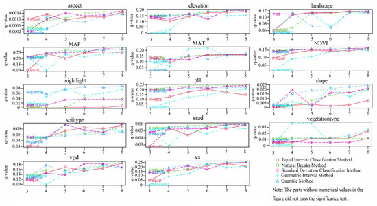 Based on the traditional factor detection method of Geographical Detector, we set the classification levels of explanatory variables to 3–8 classes using R 4.1.0 version software (https://www.r-project.org, accessed on 4 January 2025) (Figure 6). Five discretization methods were employed for optimal partitioning: Natural Breaks, Standard Deviation Breaks, Geometric Breaks, Quantile Breaks, and Equal Interval Breaks. This approach improved the accuracy and precision of the model.