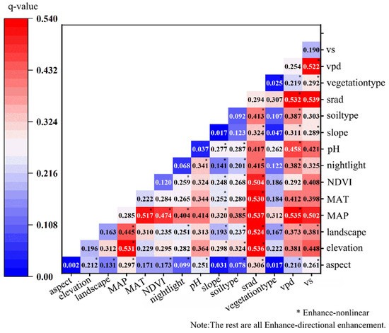 To assess how environmental variables interact to regulate SIC spatial differentiation, we applied the Geographical Detector (GeoDetector) method [30]. The q-statistic was used to quantify the explanatory power of each factor, as well as their pairwise interactions, under conventional environmental conditions. This approach allowed for the identification of synergistic or antagonistic effects among variables beyond their individual contributions. The model comprises the following core modules: