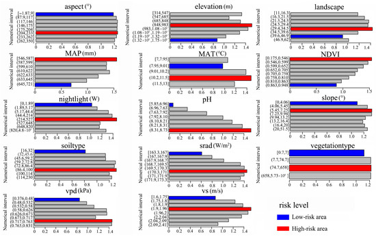 Based on risk zone detection results from the Geographical Detector (seen in Figure 8), optimal factor ranges or types conducive to SIC accumulation were identified. Specifically, these included an aspect of 204–233°, elevation of 848–983 m, forest landscape, MAP of 546–587 mm, MAT of 10.2–11.5 °C, NDVI of 0.175–0.546, nightlight of 214–527 W, pH of 8.31–8.73, slope of 5.45–7.25°, regosols soiltype, srad of 171–172 W/m2, broad-leaved forest vegetationtype, vpd of 0.717–0.763 kPa, and vs of 1.90–1.96 m/s. These driving factor ranges or types promote SIC accumulation in the study area.