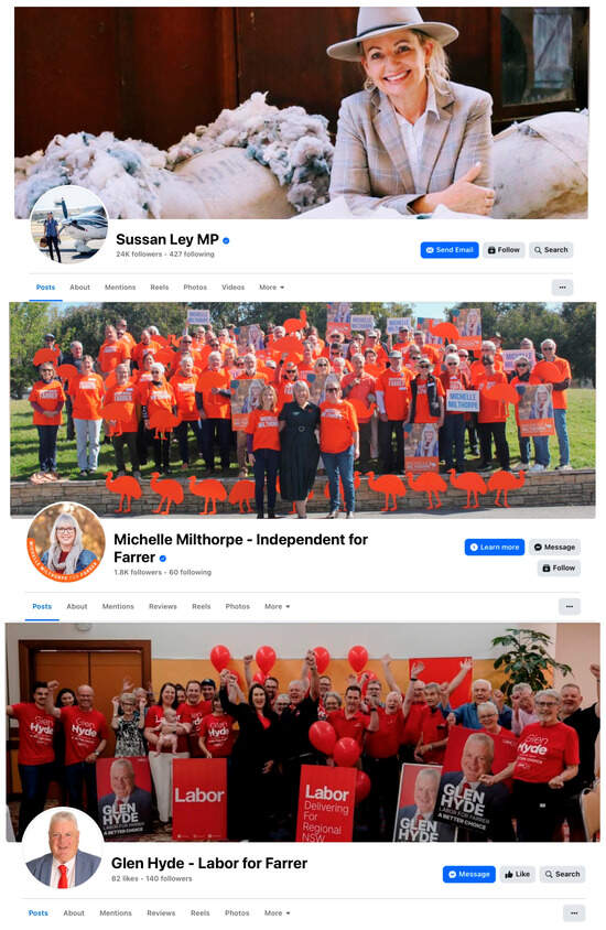 Screen shots of Facebook banners of three candidates polling the most votes in the electorate of Farrer in the 2025 Federal election.