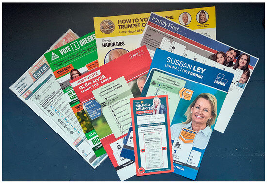 Campaigning in the 2025 Federal election involved a variety of media ranging from ‘traditional’ physical mailouts, letter box drops and advertising posters, ‘corflutes’ (weather-resistant 3–5 mm thick sheets of corrugated polypropylene plastic), as well as television advertisements, and social media campaigns via Instagram, and Facebook (Figure 2). One party made ‘a name for itself’ by sending out unsolicited text messages to people’s phones [103]. On election day, party volunteers positioned near the entrances to the polling booths were handing out how to vote cards (Figure 3) that are aimed at undecided voters and that indicate a party’s preferred sequence of preferences (Figure 4).