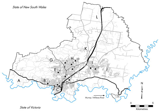 Albury is a regional service center in the southern Riverina area of New South Wales (Australia) located at the northern banks the Millewa/Murray River [120]. Based on the 2021 census, Albury’s population in 2025 was 56,084 people, approximately 77.5% of which were of election age [121]. The local government area (LGA) of Albury comprises the town’s historic nineteenth century core in the south (Central and South Albury), early twentieth century subdivisions surrounding that core, mid-twentieth century subdivisions in the north (merging the village of Lavington), late twentieth century subdivisions in the west and north together with the emerging satellite community of Thurgoona in the north east, as well as twenty-first century subdivisions in the north and in the Thurgoona area (Figure 5) [120,122].