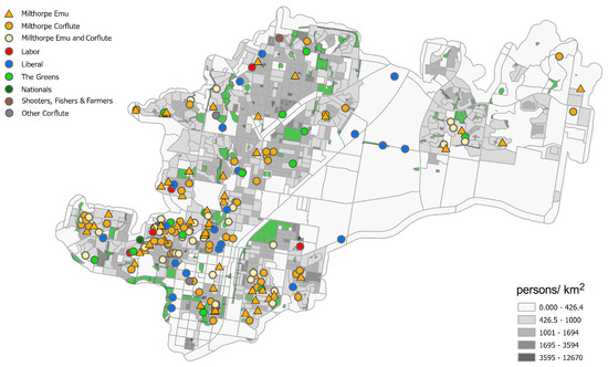 Distribution of election advertising mapped against population density (based on census mesh blocks [139]) in the area surveyed for this study (see Figure 6 for details). Map faces north.
