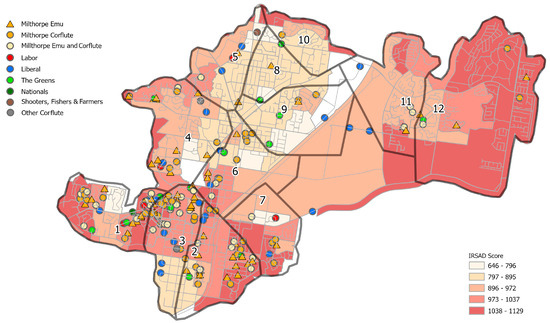 It was posited that most people who had not cast their vote at a pre-poll station would attend the polling booth closest to them. The study area was segmented into twelve polling booth ‘catchments’ based on a detailed road network including footpaths and consisting of an attribute of length in meters [138]. A Closest Facility analysis established routes from the centroid of each property to the closest polling booth, followed by an aggregation into booth ‘catchments’ via a Service Area analysis (Figure S2).