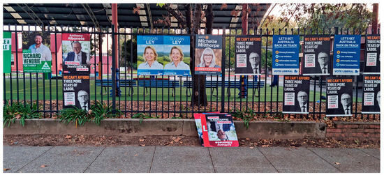While the public display of election material is permitted from the time an election is called until the end of election day, and while there are rules related to the nature and conduct of election campaigning and advertising [104,105], there are no restrictions from the perspective of electoral law other than a requirement they not be placed within 6 m of a polling place [105,106]. The public posting of election posters and corflutes is governed by laws and regulations relating to political signage as promulgated by state government (for example with regard to placing placards on electricity poles) and local council (in regard to placing placards on private fences and properties that can be seen from the street). In consequence, there is considerable variation across Australia [106,107,108].