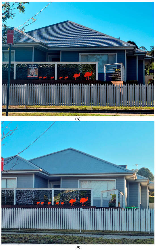 The election signage comprises co standard ISO A1 sized (841 × 594 mm) corflutes as well as signs in the shape of emus (large emus ~440 × 550 mm, small emus ~220 × 250 mm) (Figure S3d,e). While corflutes were usually mounted at the property fence or boundary facing the street, some emus were mounted on walls or Colorbond fences that were aligned perpendicular to the street. As these emus could be missed depending on their size and on the direction of vehicle movement, it is likely that the number of orange emus has been undercounted. At least on two occasions such emu signage was noted when the survey sequence required the authors to backtrack on a street that had already been surveyed.