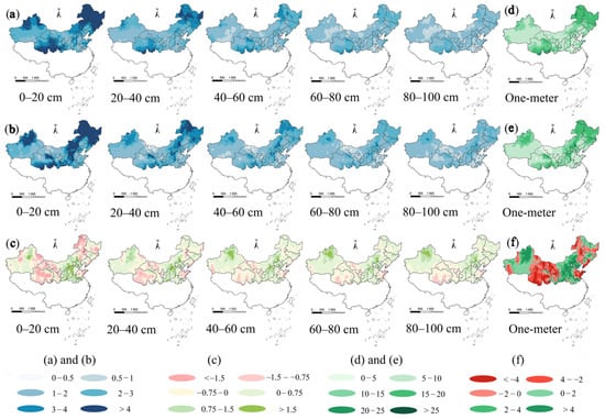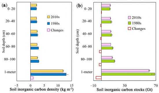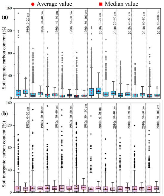 - to acquire the vertical SOC and SIC content. The organic matter and calcium carbonate data of typical soil profiles were normalized, and a normalized profile with a depth range of 0–100 cm was constructed. The profile was divided into five layers (0–20, 20–40, 40–60, 60–80, and 80–100 cm) with 20 cm intervals, and the contents of SOC and SIC in each layer were calculated.