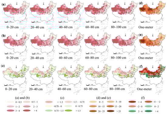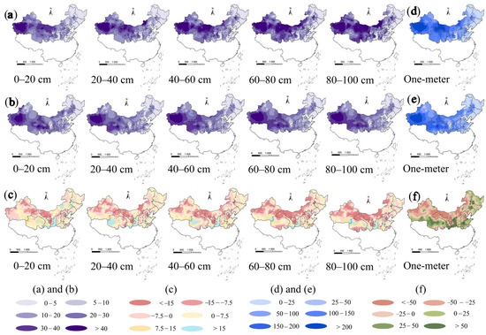 3.1.2. Spatial Distribution of Vertical Soil Organic Carbon Density and Stocks