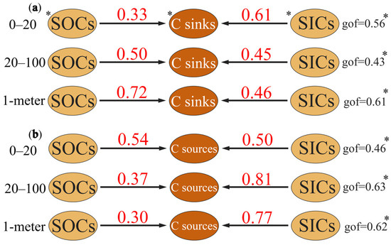 - to quantify soil C sinks and sources and analyze the relationship between vertical dynamics of SOCs and SICs and total C storage dynamics. The vertical dynamics of soil C were obtained by subtracting the soil C stocks in the 2010s from the those in the 1980s. The dynamics of soil C directly determined the distribution of soil C sinks and sources. A dynamic relationship model was built to evaluate the contribution of SOCs and SICs to C sinks and sources.