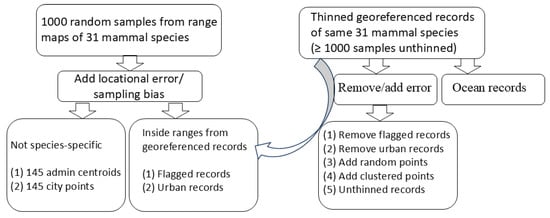 Sampling bias and coordinate errors have been attributed to be important issues for species distribution models that need to be addressed by removing samples [2,17]. However, without any particular foundation, reduction in sample sizes as a preventative measure may result in lack of complete species distribution models (omission errors) or incorrect models outside of distributions (commission errors); therefore, data cleaning beyond basic corrections for unique coordinates of observations during specific years may obscure the samples [27]. For this study, I weighed the influence on species distribution models of sampling bias and various errors commonly identified by coordinate cleaning packages, by modeling 31 mammal species, with georeferenced records of at least 1000 samples (i.e., relatively stable due to enough information from samples; before thinning although potential errors and bias were added to thinned records) that provided realized sampling and also 1000 randomly generated samples from range maps, as objective measures of unbiased sampling with imperfect locations [28]. Relatedly, I contrasted differences between models from thinned and unthinned (i.e., with sampling bias due to concentrated species observations) georeferenced records. The georeferenced records, of which 94% of records were sourced from iNaturalist [3] in the GBIF database [20], were a real, not virtual, source of potential errors. Basic processing limited observations to unique terrestrial coordinates with tagged uncertainty of less than 1 km, and few records occurred before even 2015 (i.e., <5%). These are impeccable georeferenced records, not museum records. All the randomly generated samples from range maps were sampled without bias yet locationally uncertain because no species occurrences in fact were sampled. Without empirical observations, these pseudopresence samples are generally correct representations of the extent of occurrence but without any locational precision of the area of occupancy. I performed the following assessments, holding all else in modeling equal, to examine how locational errors and sampling bias affect species distribution models (Figure 1).