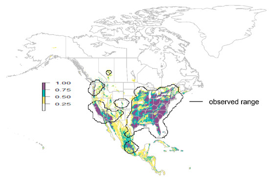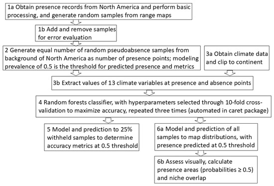 For modeling of the untruncated samples for each species, I applied the random forests classifier, an ensemble nonlinear model, with hyperparameters determined through 10-fold cross-validation, repeated three times (hyperparameters automatically selected by the caret package; [36,37]). I modeled one time with 75% random split of the samples to determine how well the model predicted the withheld 25% random split of samples. The modeling prevalence, or ratio of presence and absence points, was 0.5, which is the basis for establishing a threshold for presence at 0.5 predicted probability, along a continuous range of climate suitability. I modeled a second time with all of the samples to map predictions to North America during 1981–2010. All methods and variables (13) were held constant except for the source of samples. Correlated climate variables are not an issue for predictions but for standard error of estimates in data models [30].